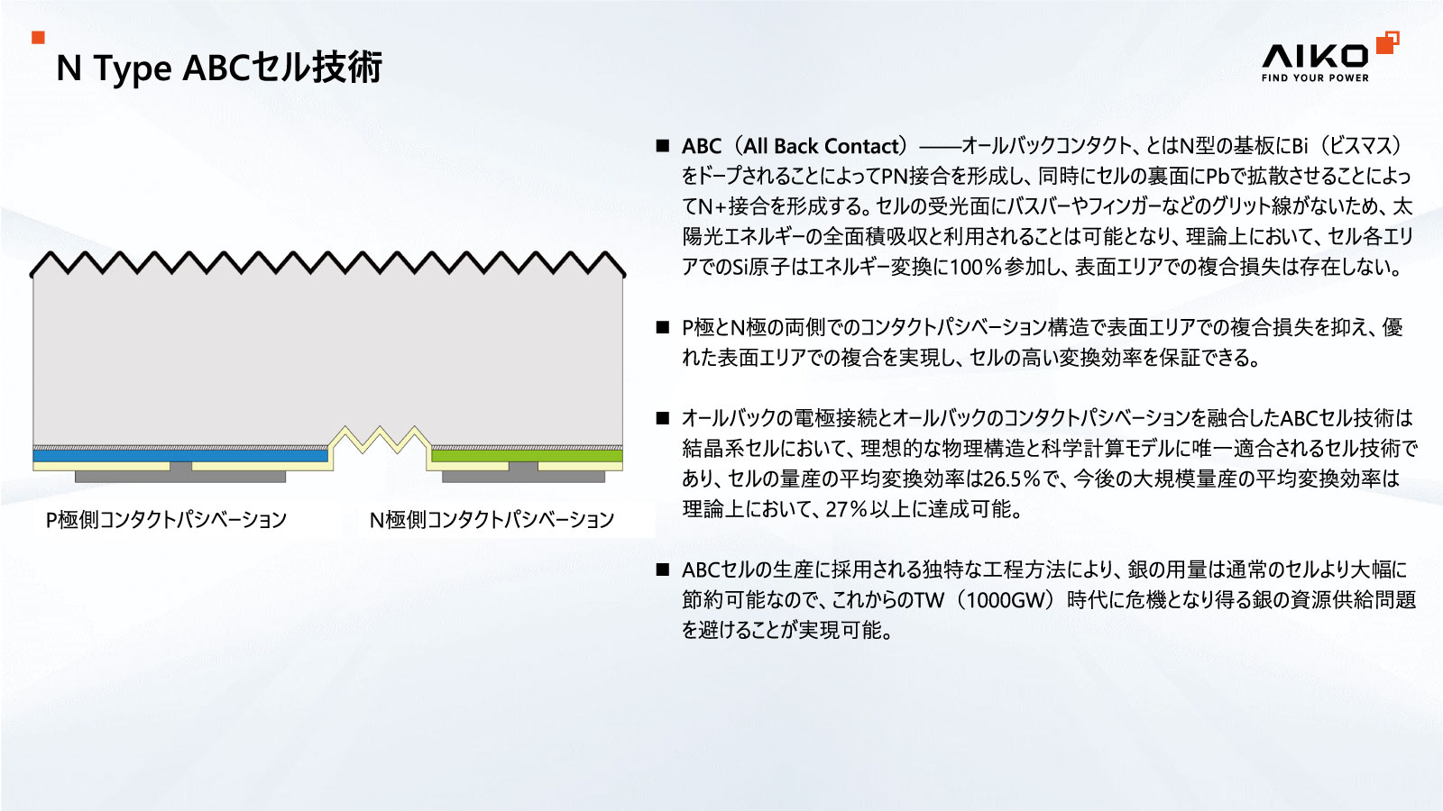 ABC(オールバックコンタクト)はバスバーやフィンガー電極といったセル表面の配線を裏面に配置することで、セル割れの発生リスクが少なく、すっきりとした美しい外観が特徴です。