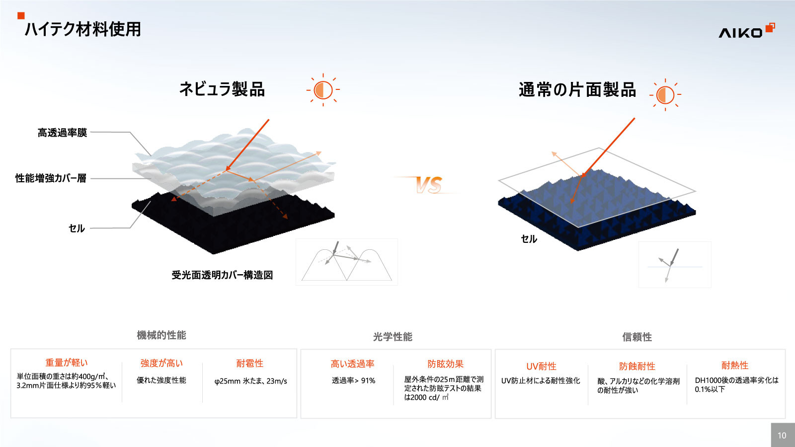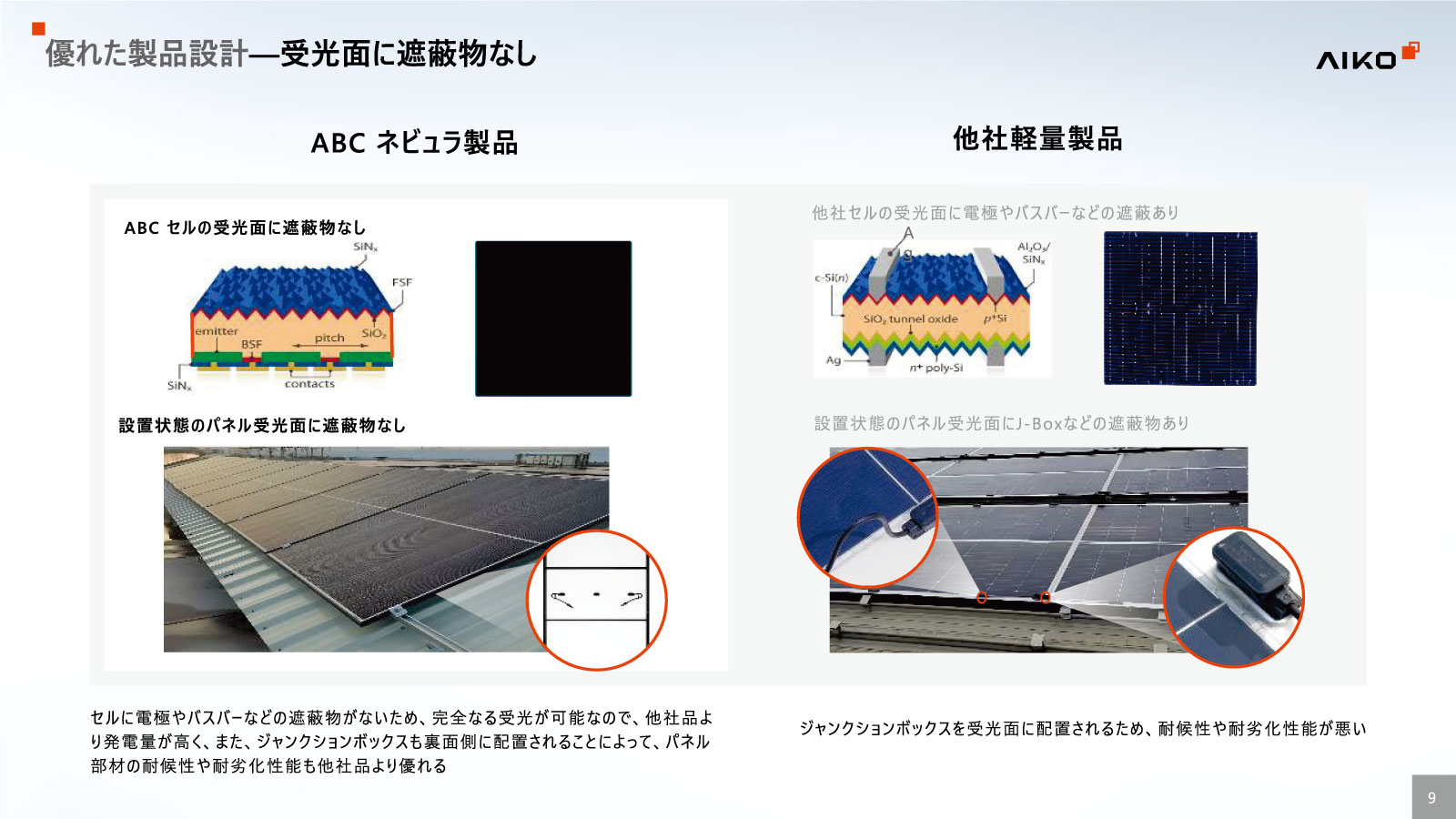 従来製品より光吸収率と電力変換効率もアップし、高温時や低照度下でも高い発電性能を維持するほか、出力劣化の抑制にも大変優れています。