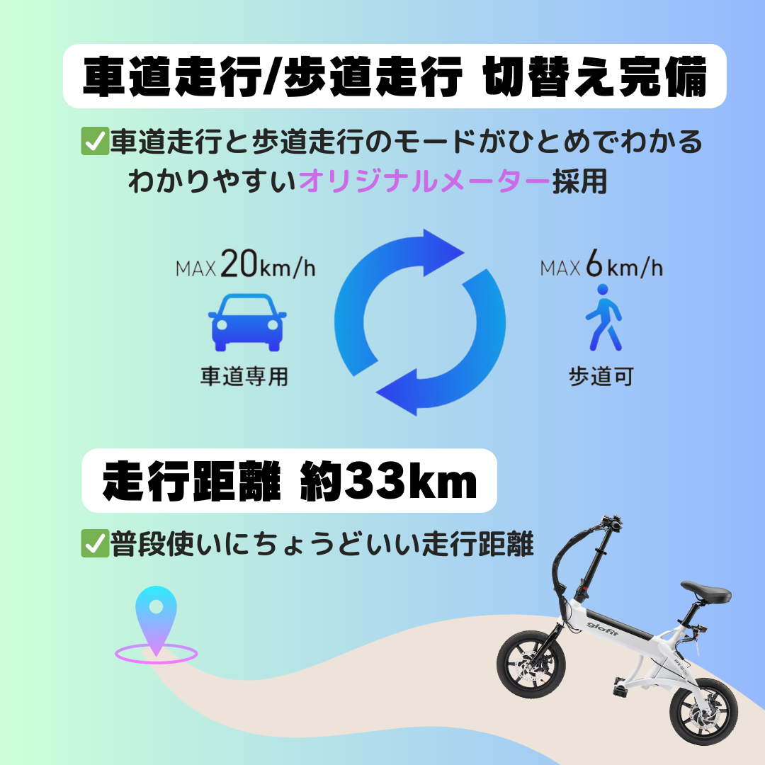また、特例特定小型原動機付自転車(6km/hの歩道走行モード)に切り替えた場合に限り、自転車の通行が可能な歩道や路側帯を走行できます。必ず走行モードを確認し切り替えを行ってから走行しましょう。