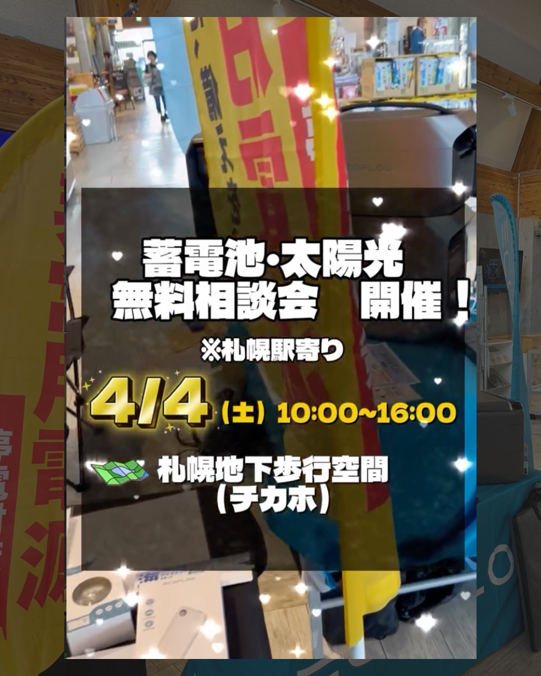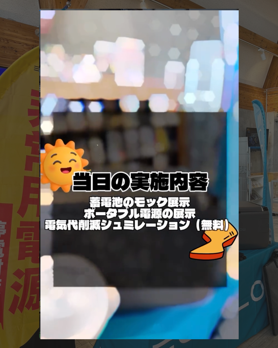 一部ポータブル電源の展示も行います。今後蓄電池の導入を検討されている方にはお見積もりも承ります。